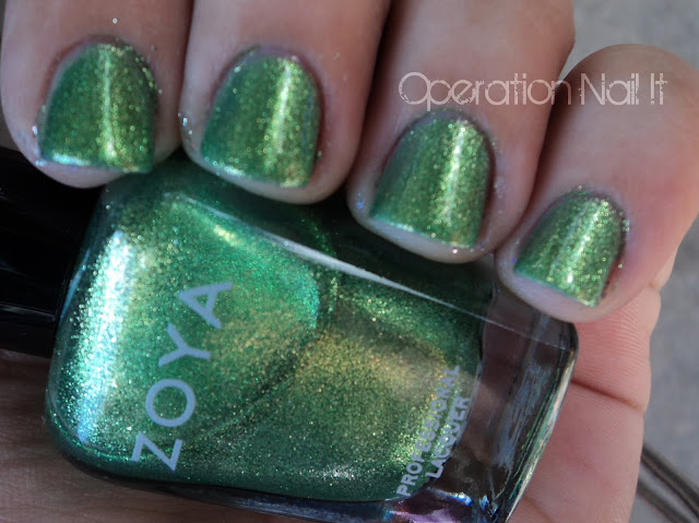 Apple. 3 coats. Light green loaded with gold shimmer. Beautiful glass flecks color. Nobody does glass flecks like Zoya. This color is awesome! It looks a lot like Ivanka but its a much lighter green. It was a little sheer, I needed 3 coats for full opacity but for this color, I don't really mind. Its a green and its perfect!